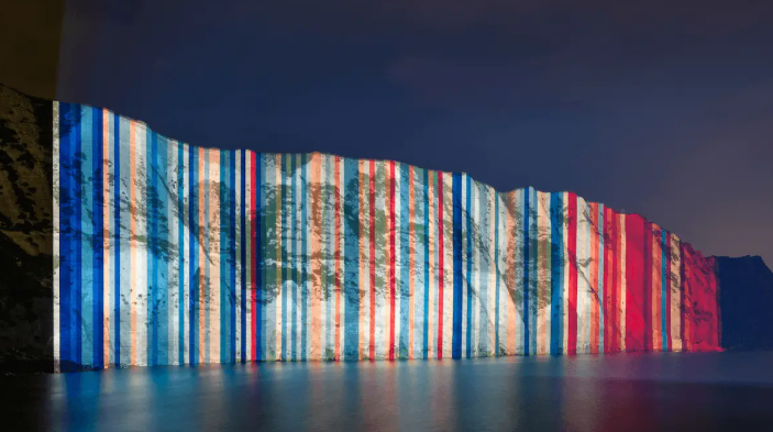 Der Klimastreifen zeigt die Änderung der Jahresmitteltemperatur in Bodennähe für Deutschland. Die Klimadaten stammen vom Deutschen Wetterdienst (DWD) und die Visualisierung wurde von Ed Hawkins (Universität Reading, GB) entwickelt. Für diese Art der Darstellung werden die Daten von 1971-2000 gemittelt und dieses Mittel wird dann von den jeweiligen Jahresmitteltemperaturen abgezogen. Die Abweichungen von diesem Mittelwert werden nun eingefärbt: kältere Jahre in Blautönen, wärmere Jahre in Rottönen. Für spätere Jahre werden die Rottöne häufiger und kräftiger – das Zeichen einer Erwärmung über die gezeigten Jahre hinweg.